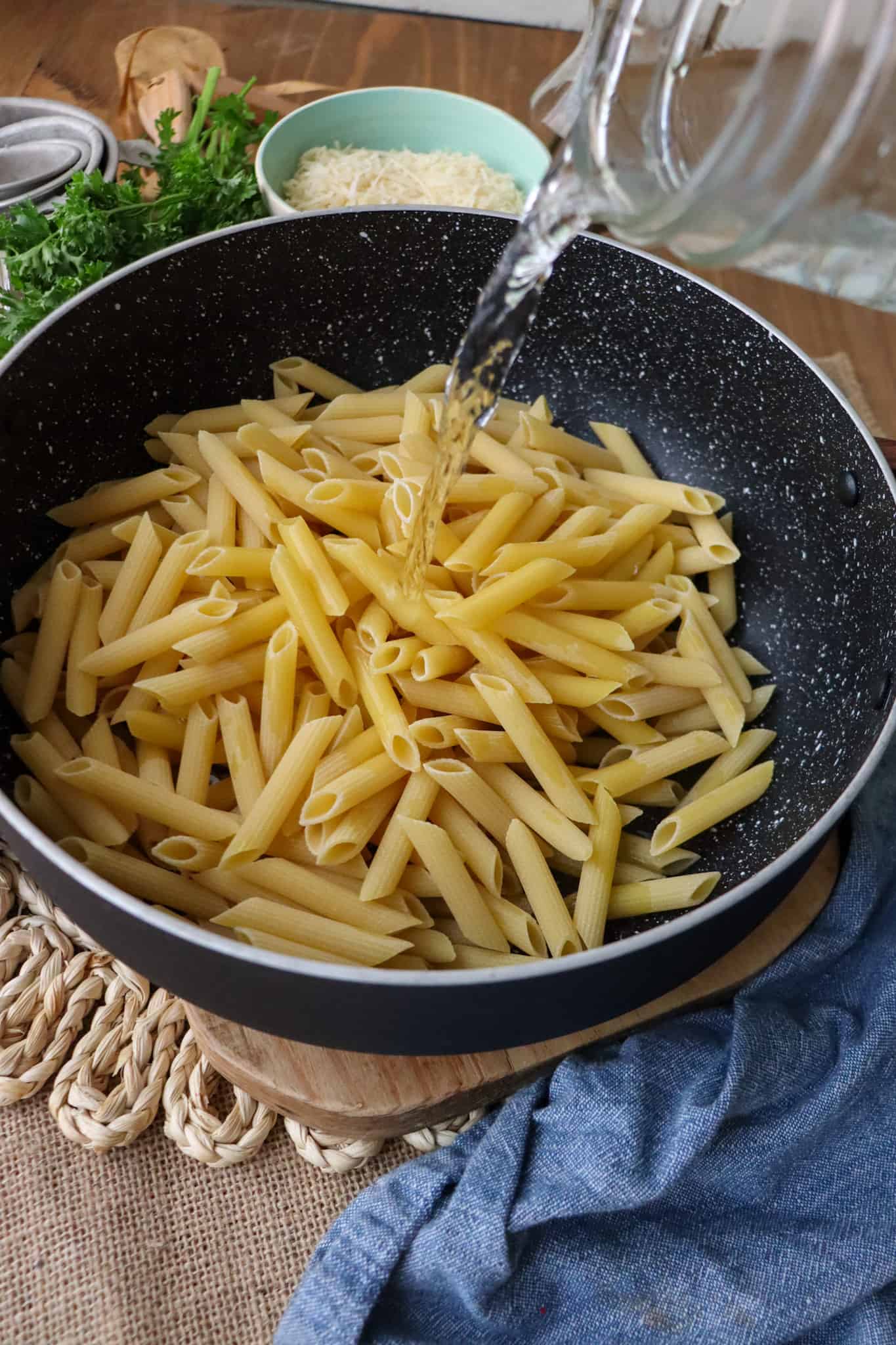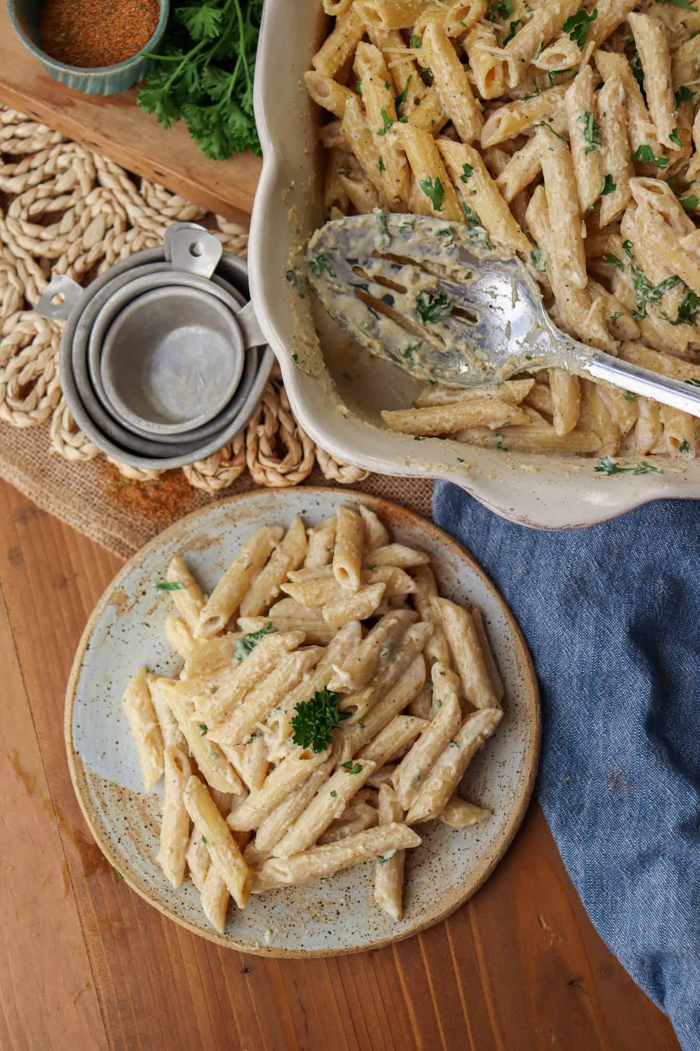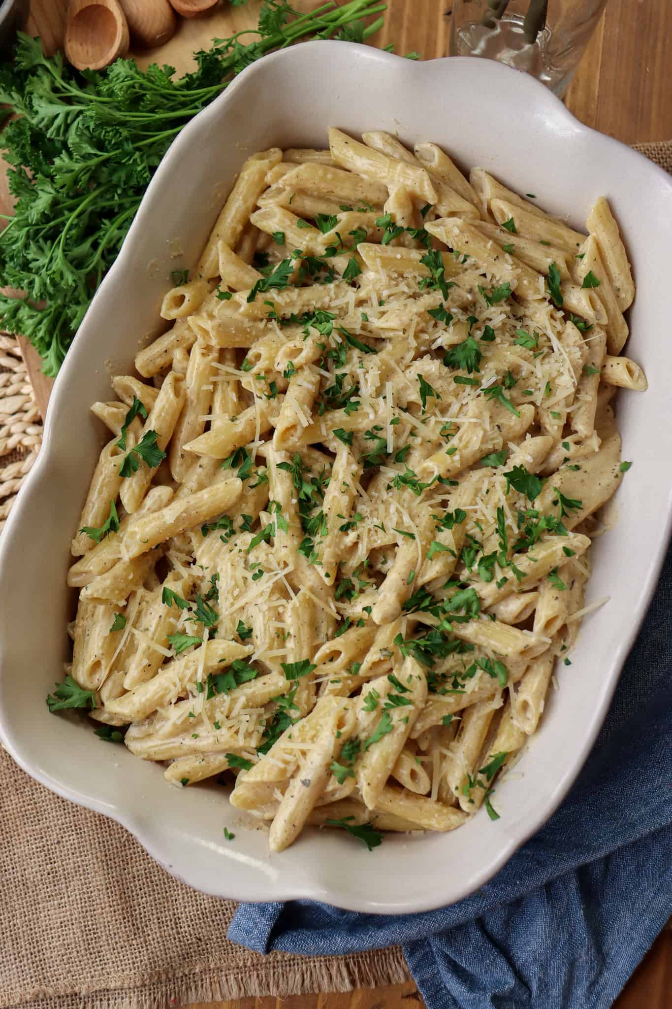 - At this point, your dish is done, serve directly from the pot or place the pasta in a serving bowl and garnish with additional parmesan cheese and minced parsley.