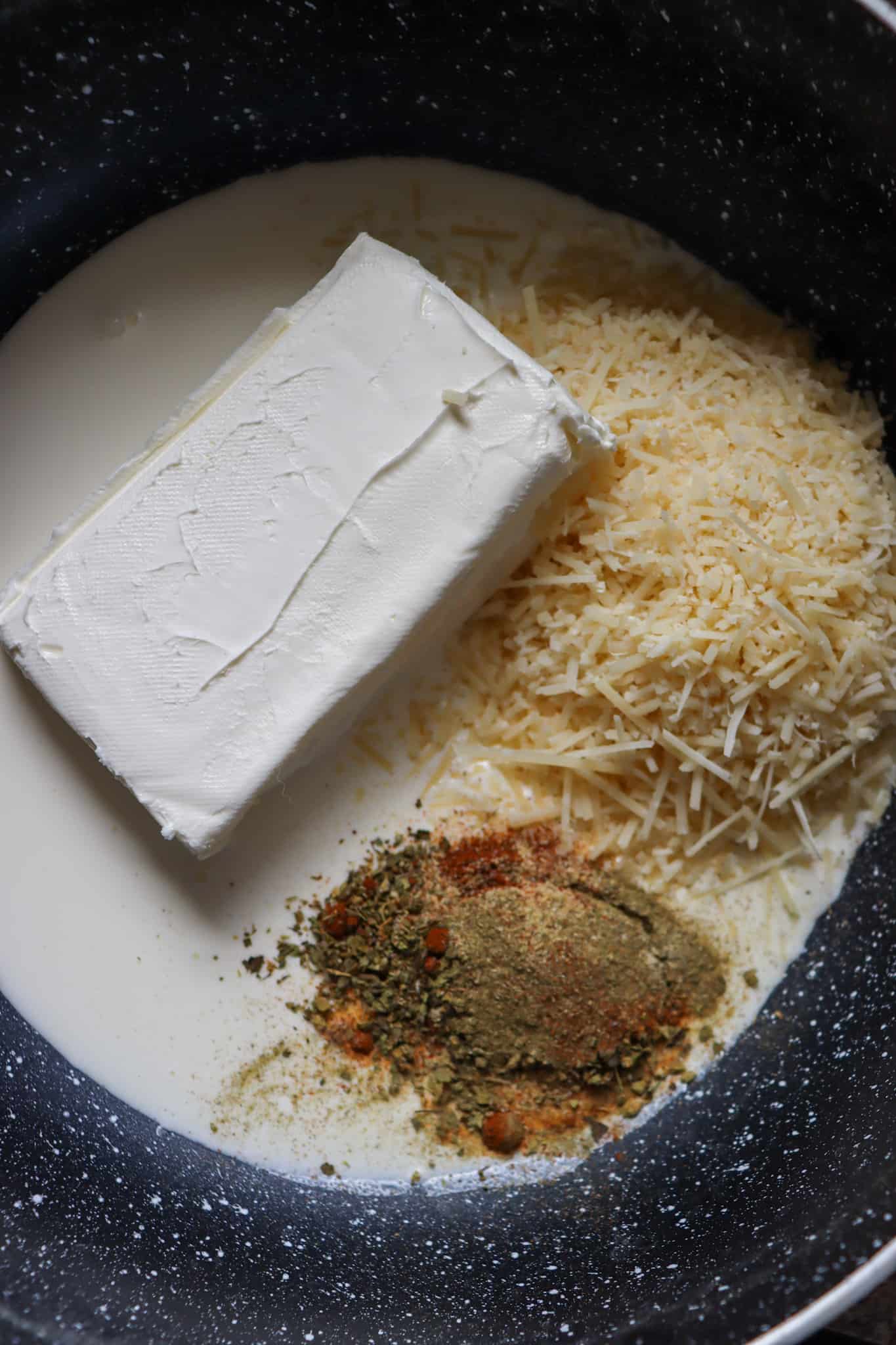 3. In the same pot you cooked your pasta place your cream cheese, reserved pasta water, heavy cream, parmesan and cajun seasoning. Set to medium low heat and stir until the parmesan is fully melted and the cream cheese is completely incorporated.