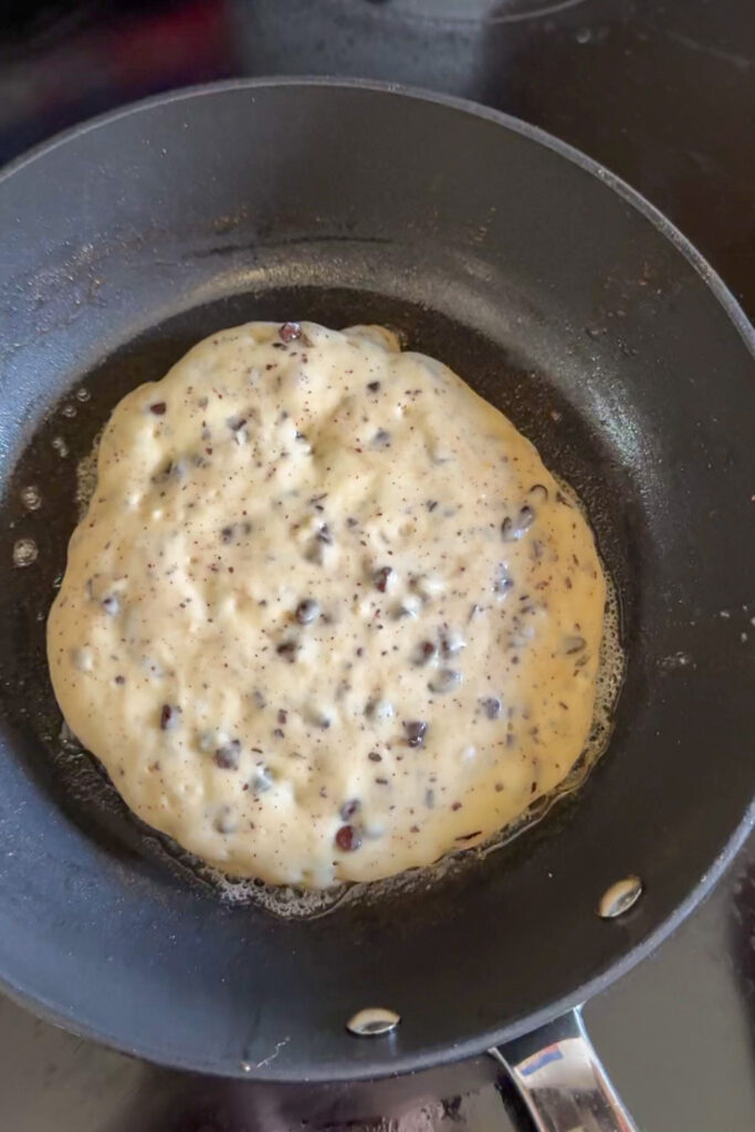 • Pour about ¼ cup of batter into your prepared pan and cook until the edges are dry and little bubbles start to form, then flip and cook the other side.